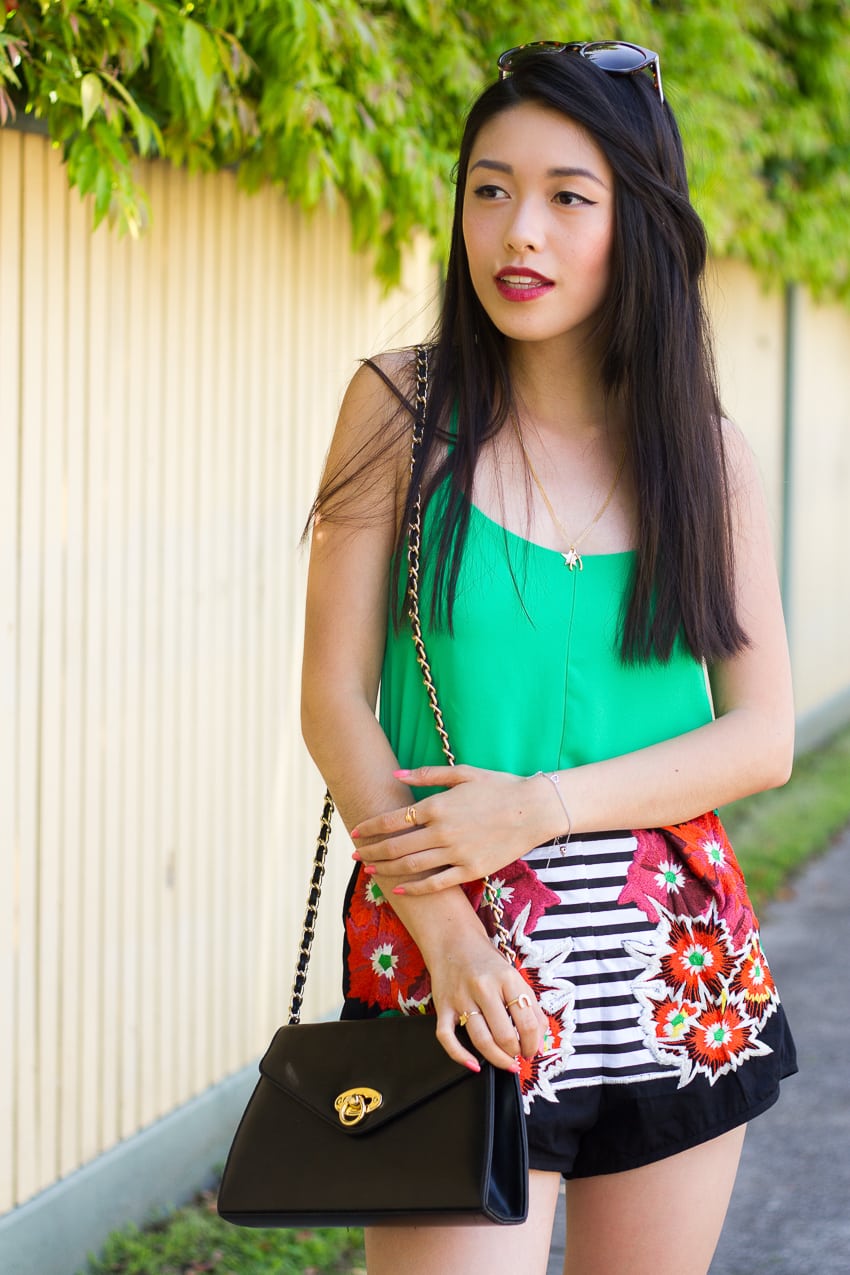 Wearing: Topshop green cami dress as top (similar here & here), Alice McCall Bournemouth Belle shorts, RMK Coachella heels (similar here & here), Oscar Wylee Brooke sunglasses (similar here), vintage black clutch (similar here), The Dark Horse horseshoe ring (similar here & here), vintage butterfly ring and Jolie & Deen star & wishbone necklaces. Nails: Dior Vernis 'Bouquet'. I think I've done too much yoga this week. I've been five times over the past seven days and that's five times more than the amount of times I've seen Tom. It's no wonder that I am suddenly finding myself wanting to do tree poses with real trees, lighting Balinese Ylang Ylang candles and playing meditative flute music late at night. Something's gotten into me with all this vinyasa in my life! Thank goodness for an accidental sleep in that I've missed today's class - finally, a blog update featuring the prettiest delivery of floral embroidery on these Alice shorts. I've never been one for black but it looks like I'm starting to take baby steps forward..!Photos: Rowena Cao.